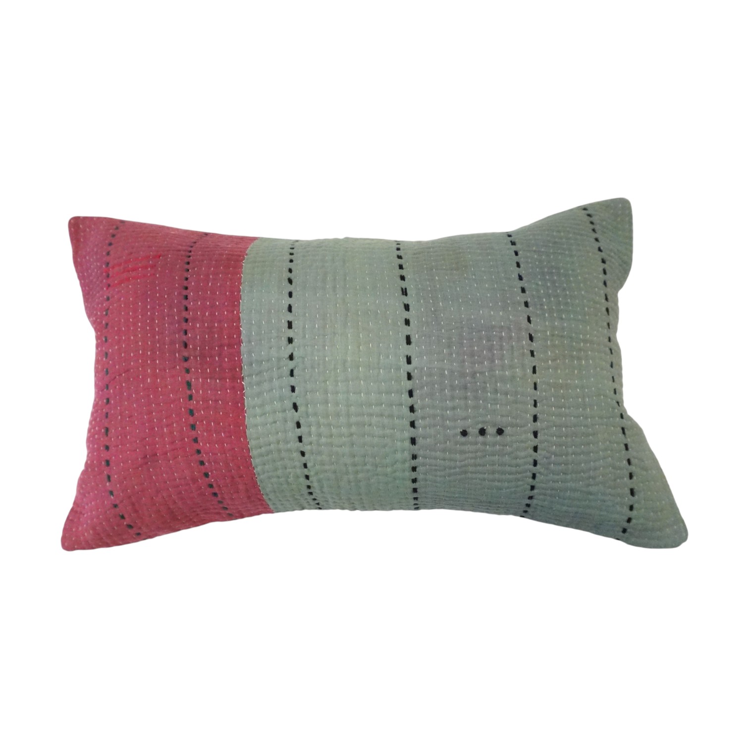 Coussin en Kantha et fines rayures réalisées au block de bois.