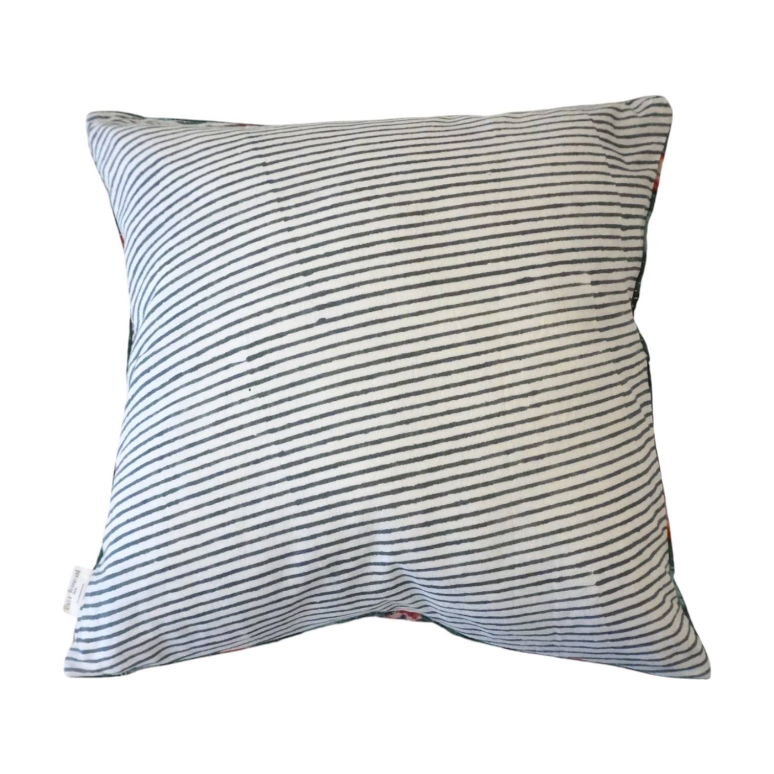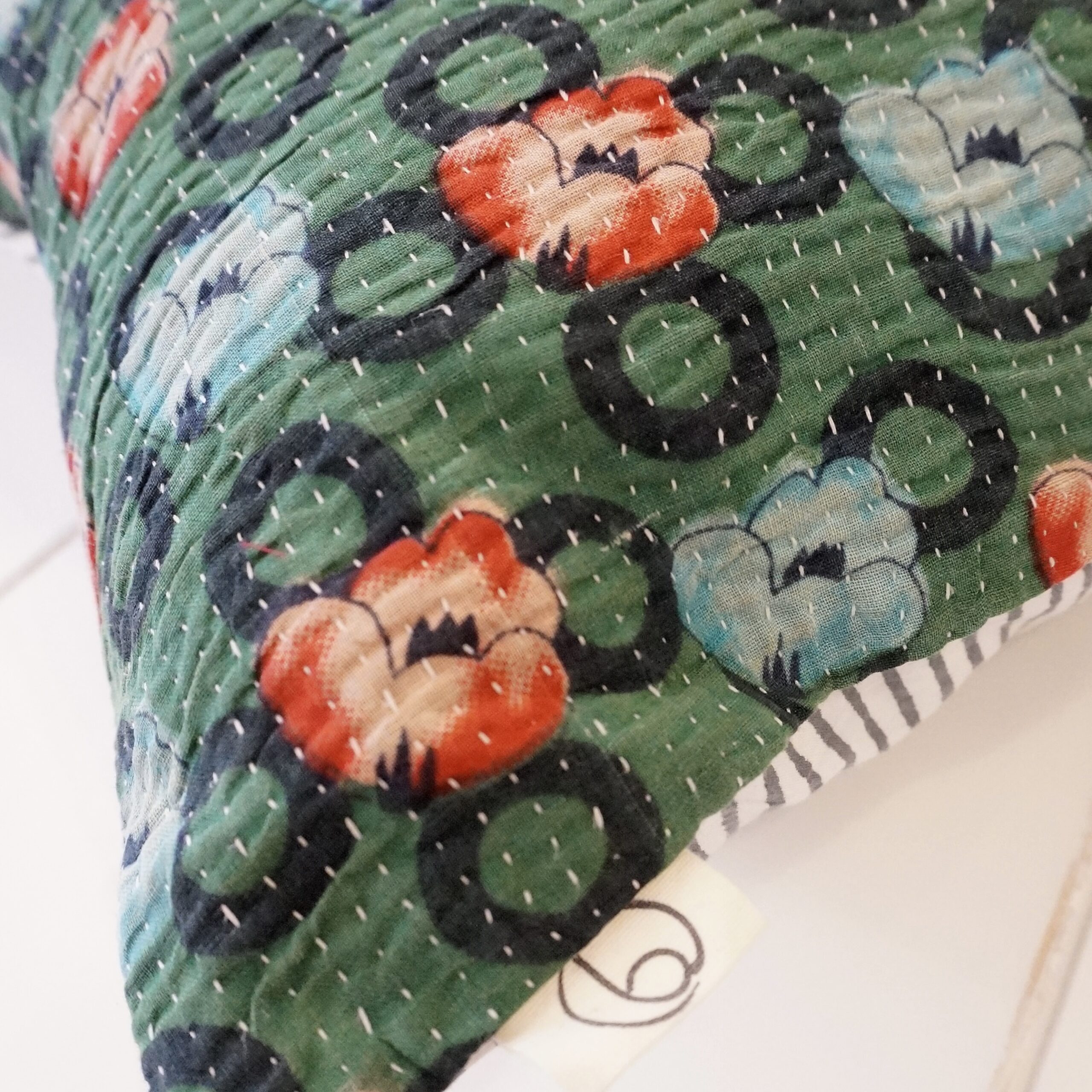 Coussin en Kantha et fines rayures réalisées au block de bois.