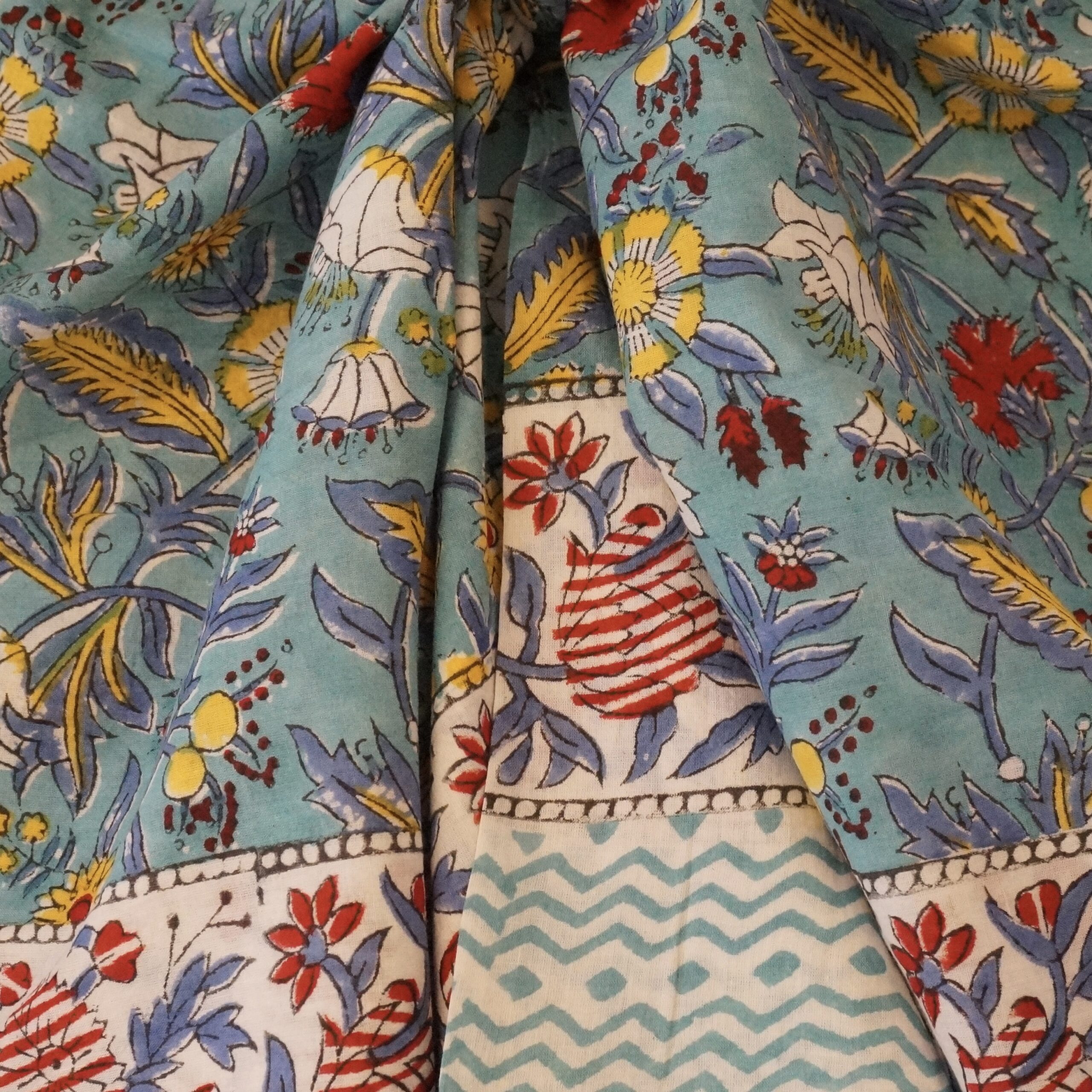 En écharpe, cette étoffe imprimée au bloc de bois d’une manière artisanale en Inde fera tout son effet avec ses jolies couleurs et cet imprimé fleuri.