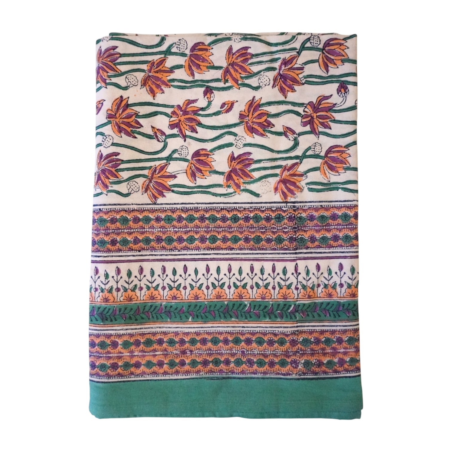 Cette nappe en coton a été imprimée de manière artisanale au bloc de bois en Inde.