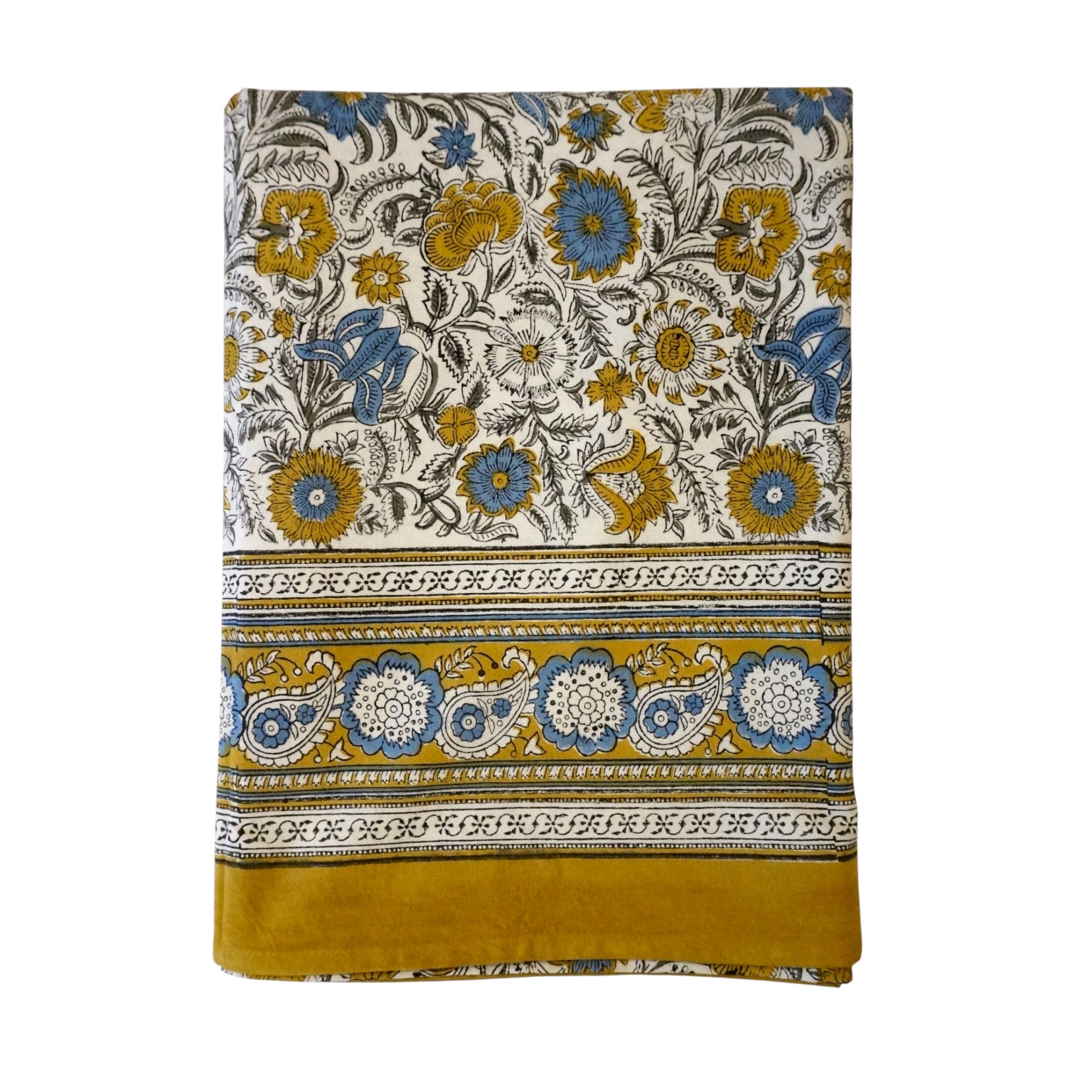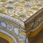 Cette nappe en coton a été imprimée de manière artisanale au bloc de bois en Inde.